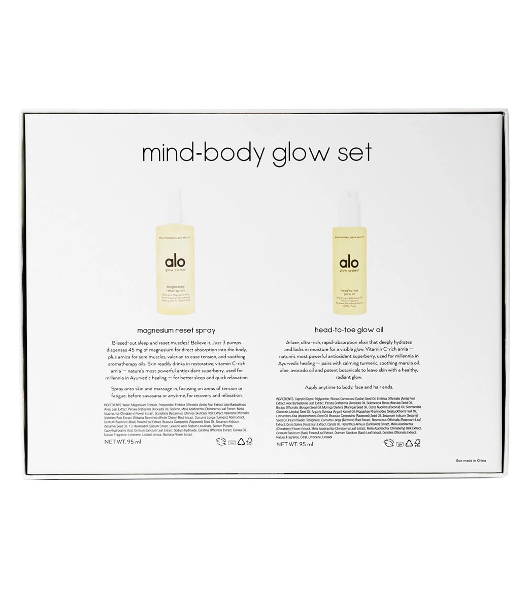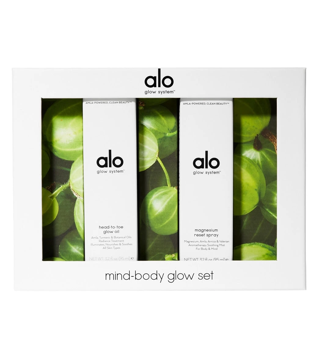 Put mind-body tension to bed with a set made in stress-melting heaven, featuring the Alo Mind Body Glow Set. Luxe, ultra-rich, rapid-absorbing Head-to-Toe Glow Oil deeply hydrates from split ends to toes with vitamin-C and E-rich amla, calming turmeric, and soothing marula oil. With just 3 pumps, Magnesium Reset Spray dispenses 45 mg of magnesium, plus arnica, valerian, and soothing aromatherapy oils to bring on the chillest vibes.