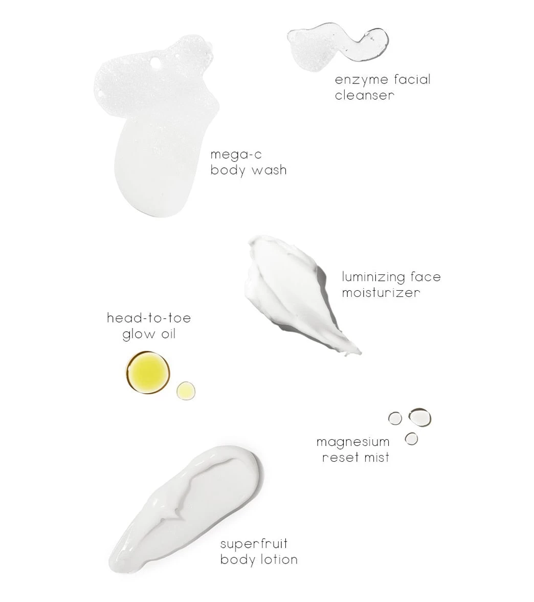 - Includes 2 essential treatments for face: Enzyme Facial Cleanser and Luminizing Face Moisturize; 2 powerful elixirs for the body: Magnesium Reset Spray and Head-to-toe Glow Oil; and 2 power players for use on the daily: Mega-C Body Wash and Superfruit Body Lotion