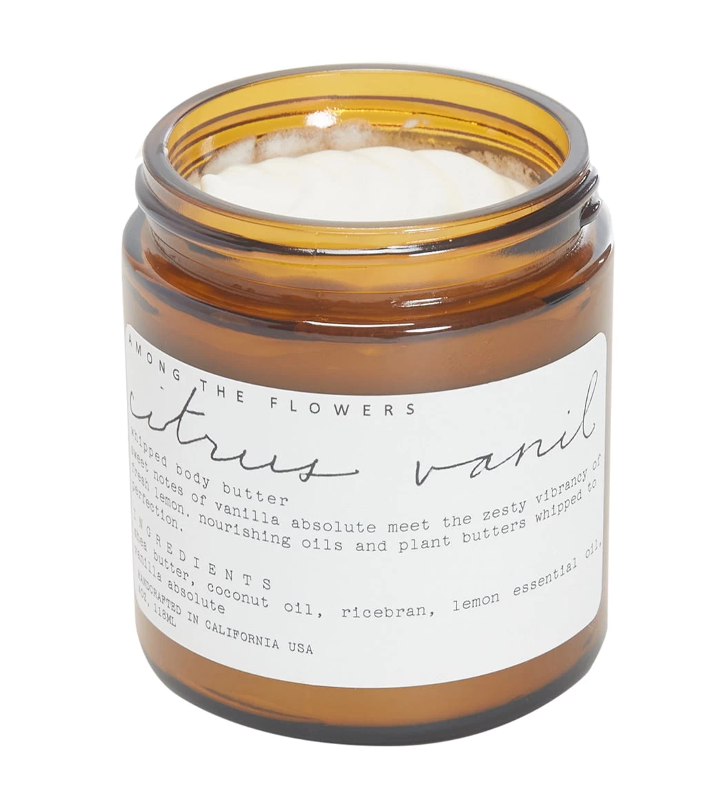 A combination of whipped coconut oil and shea butter, essential oils, and highly effective nut and seed-derived oils come together in this luxurious Among The Flowers Citrus Vanilla Body Butter. For deep moisturizing and extra dry skin.