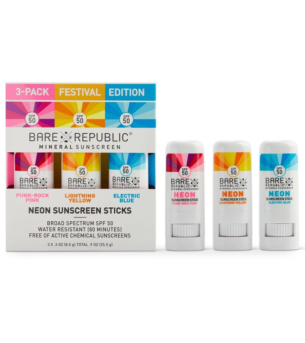 Protect your skin in style with the BARE Republic Mineral Neon SPF 50 Color Sport Stick 3 Pack