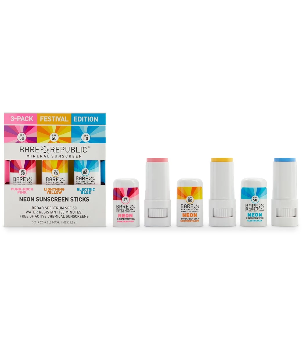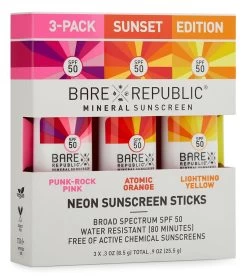 Protect your skin in style with the BARE Republic Mineral Neon SPF 50 Color Sport Stick 3 Pack