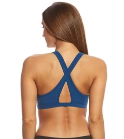 Update your studio staples with this Studio Yoga Sports Bra. A solid sports bra is updated with and on-trend high neckline and cutout, cross back design.