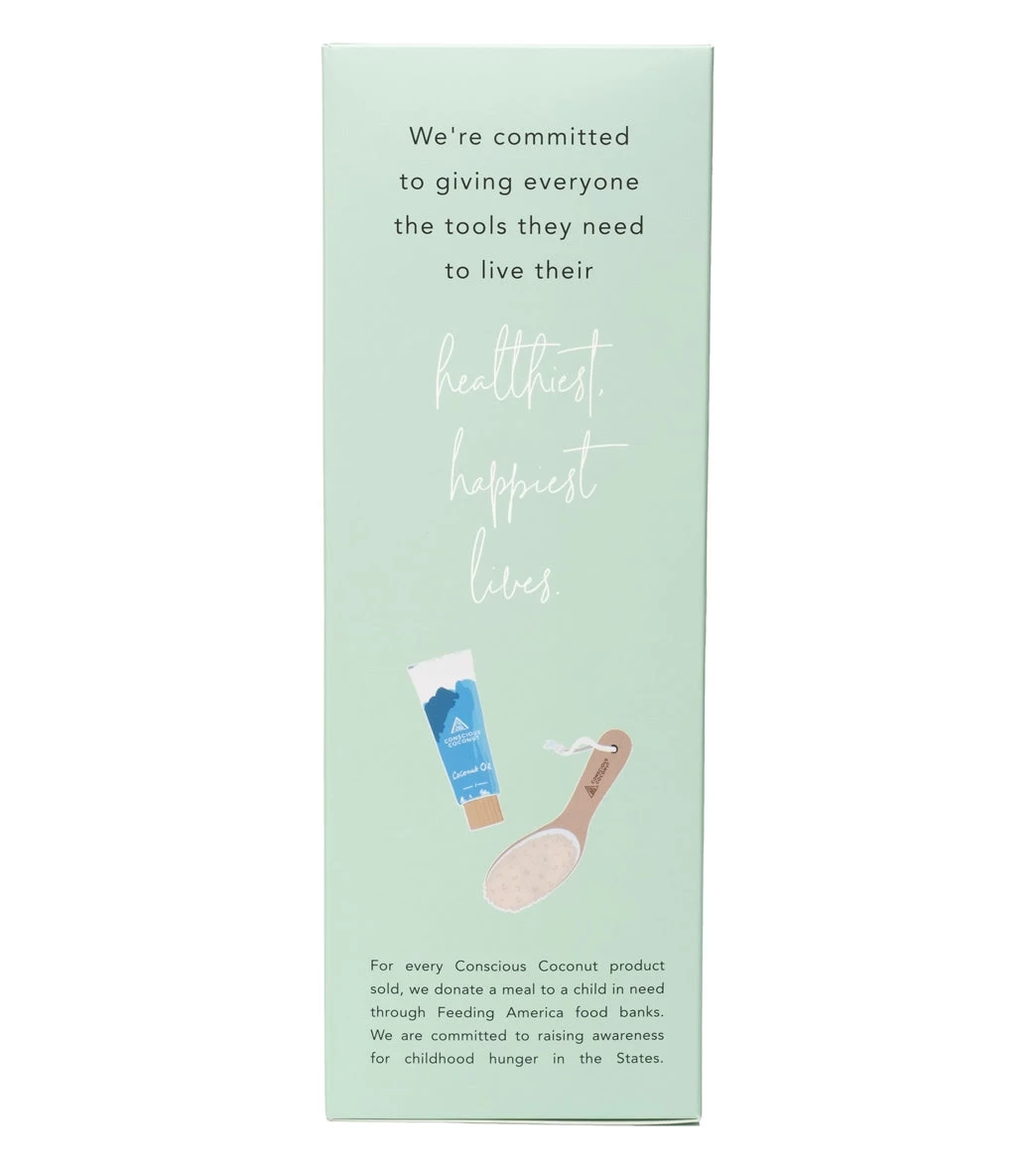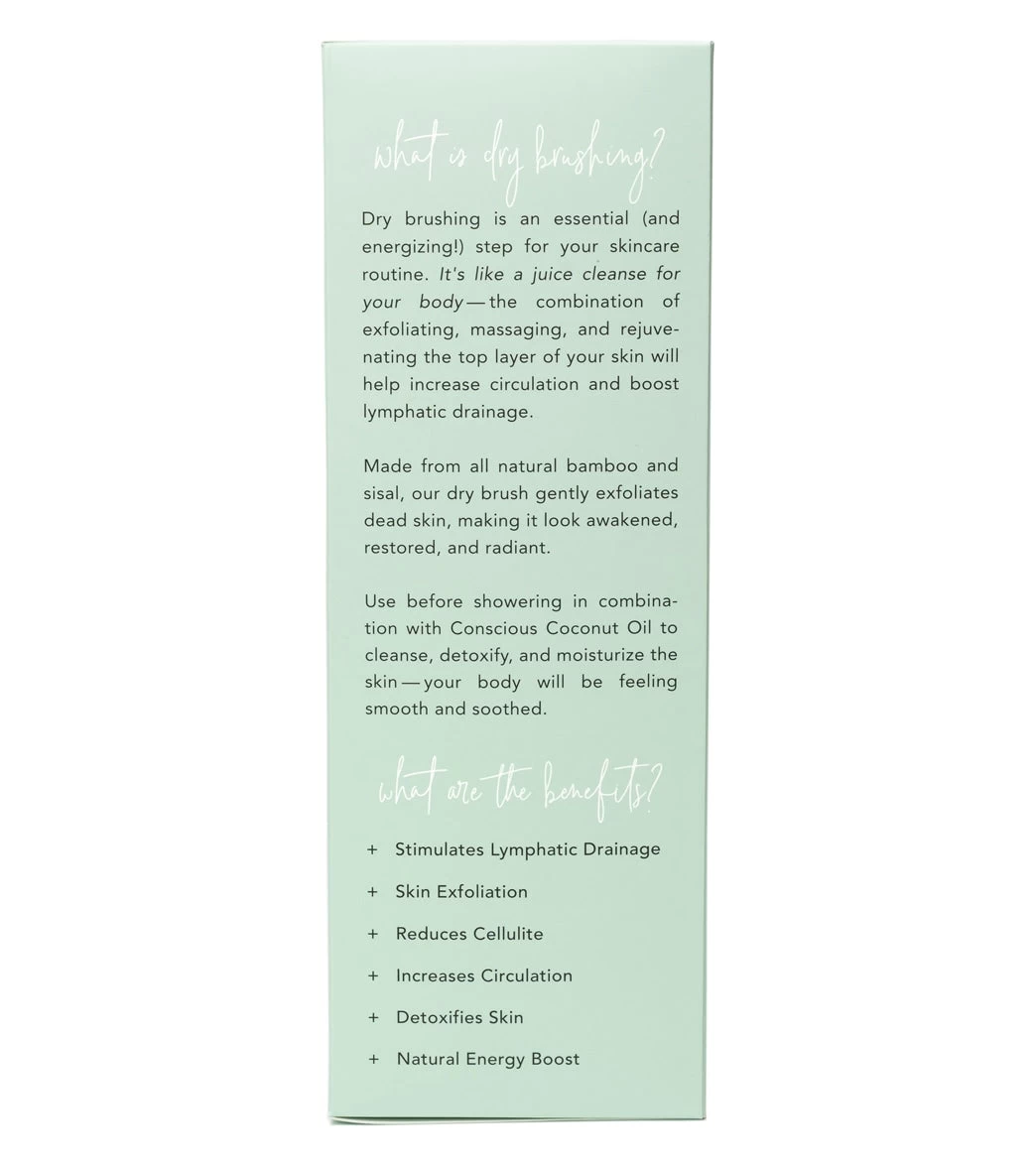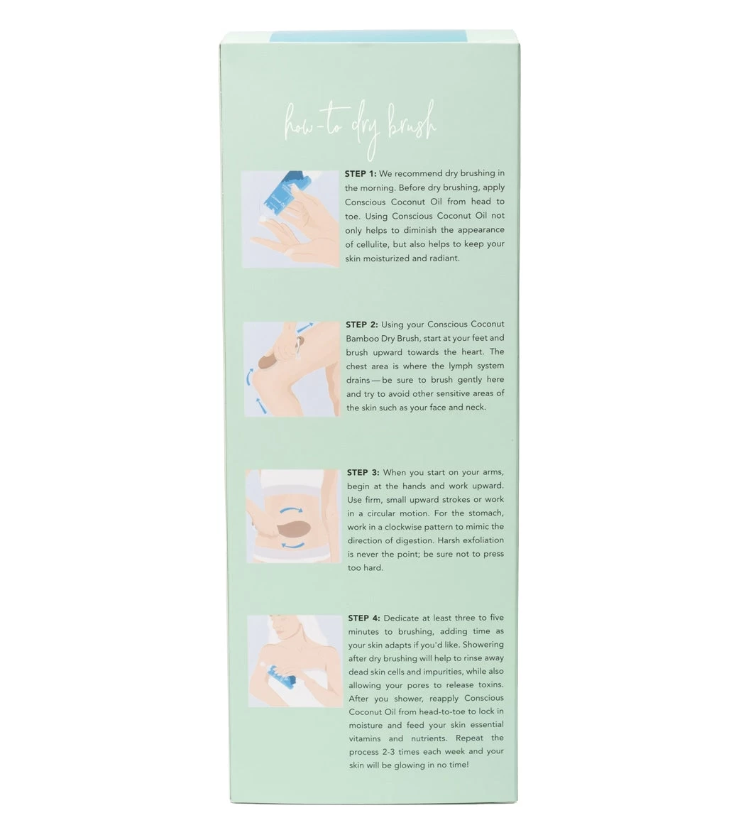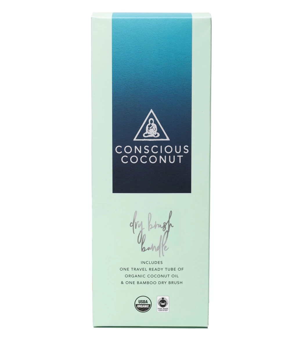 - One Conscious Coconut Dry Brush Bundle contains one Travel-Ready Coconut Oil Tube, one Vegan Bamboo Dry Brush, and How-To Dry Brush Instructions