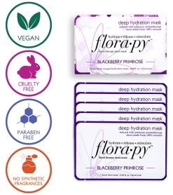 Practice self-care with the Florapy Deep Hydration Aromatherapy Sheet Mask 5 Count, Blackberry Primrose.