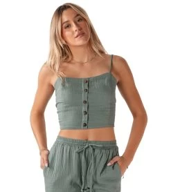 - Featuring coconut buttons down the center and a tie back