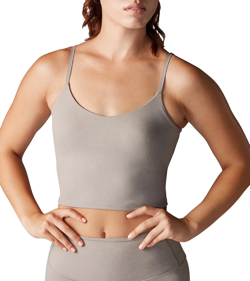 - : Cami bra. Solid. Scoop neck. Light to medium support. Stay cool sweat wicking fabric. Removable soft cups. High spandex content for shape retention. Flattering scoop neckline. Stunning tonal python print.