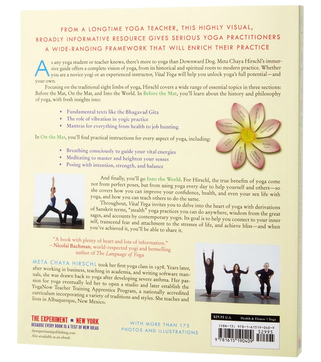 Enlighten yourself with Vital Yoga: A Sourcebook for Students and Teachers. Written by longtime yoga teacher Meta Chaya Hirschl, this informative book will teach you everything there is to know about yoga–from its historical and spiritual roots, to modern practice, and how you can incorporate yoga into your every day life to let go of stress and achieve bliss.